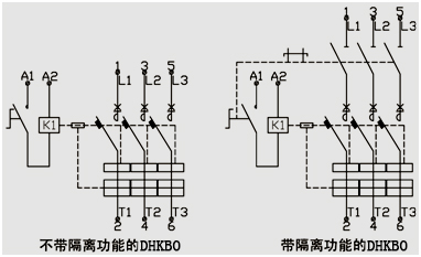 主電路接觸組由動、靜雙斷點觸頭、柵片滅弧室、限流式快速動作機構和殼架組成,每一極為一組,彼此相互獨立,在負載端發(fā)生短路時,快速動作機構動作并迅速分開主觸頭來切斷電路,同時帶動操作機構自由脫扣,同時切斷控制線圈回路,使各相主電路處于斷開狀態(tài),由于主電路接觸組中采用了先進的限流式快速短路脫扣器與性能優(yōu)越的滅弧系統(tǒng),使DHKBO具有極高的短路分斷能力。